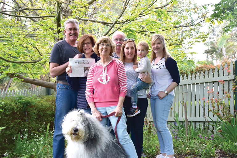 CV Weekly Publisher Robin Goldsworthy of course brought along the Crescenta Valley Weekly when she and her husband Steve traveled to Australia. Shown with Steve and Robin are Joy McGrath with sheepdog Sophie, Bruce McGrath, Julie McGrath Schofield (holding her son Joshua) and Cheryl McGrath.