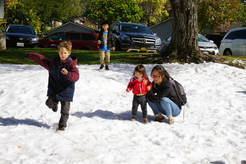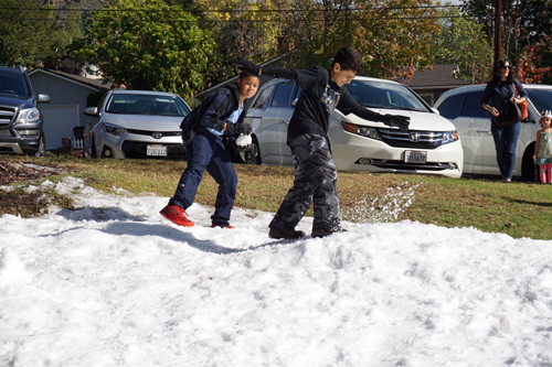 Last Saturday at Two Strike Park, families gathered for the treasured Winter tradition of playing in the snow. But in the Crescenta Valley, with temperatures comfortably in the 60°’s, playing in the snow is a rare treat. The Los Angeles County Department of Parks and Recreation hosted a Snow Day by having ice brought in and shredded into snow for local families to come and enjoy.