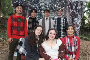 As artificial snow falls, La Cañada High School Chamber Singers treat visitors to Christmas carols at the Lanterman House on Sunday.