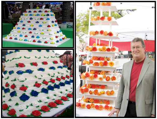 The Montrose Shopping Park knows how to throw a memorable birthday party. This Sunday we are celebrating Montrose turning 102! The mayor and Glendale city officials will be joining us to present awards. There will be lots of food and entertainment spanning two blocks. The Harvest Market will be in full swing. But for me the day seems to revolve around the birthday cake. Here are some pics of our cakes going back to 2004. This year, working with Henry Baeza of Montrose Bakery, we have a spectacular new design and color combo for our cake! Watch for multi-tiered circular cakes of all sizes, decorated in red and pink roses with strawberry cream inside! I can hardly wait! The ceremony starts at 2 p.m. at the stage in front of Billy’s Boardshop where you will once again find Robin Goldsworthy and me, knives in hand, ready to cut and serve. There’s nothing like freshly baked birthday cake!