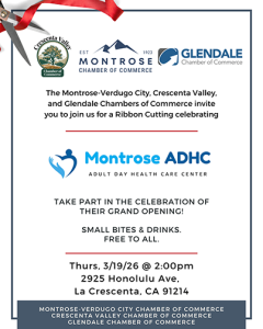 Then on Thursday, March 19 members of the boards of the CV Chamber and Glendale Chamber will join the Montrose-Verdugo City Chamber in welcoming new business ADHC (Adult Day Healthcare Center) at 2925 Honolulu Ave. Beginning at 2 p.m., this event will include a ribbon cutting, celebrating a business focused on senior citizens.