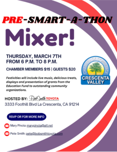 Tonight, March 7, is another mixer. This one is the pre-Smart A Thon mixer that is being held at Bob Smith Toyota, 3333 Foothill Blvd. in La Crescenta. It’s unique in not only will it give local businesses and residents a chance to mix and mingle but it is when the Mary Pinola Education Fund will distribute grants! (The attached flyer has more details.)