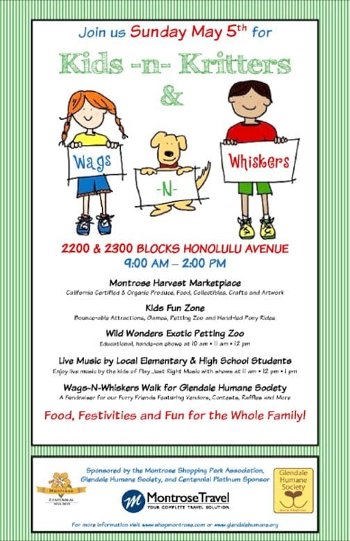 Sunday, May 5 is a day you will definitely want to spend in the Montrose Shopping Park. It seems all of the stars have converged at the same time and the activities and entertainment are boundless. Of course, it’s prime time for our weekly neighborhood reunion, the Sunday Harvest Market. That is always enough fun in and of itself. Layer on our 9th Annual Wags-N-Whiskers event benefitting the Glendale Humane Society that will have you singing “Who Let The Dogs Out? Ruff! Ruff! Ruff! Ruff!” On top of that is Kids-N-Kritters when we bring in pet and animal treats for the kiddos. For all the foodies in town we have tied in Taste of Montrose benefitting Prom Plus when you buy a $20 bracelet that lets you sample food from our numerous restaurants. And the icing on the cake is Cinco de Mayo, which just happens to fall on that day. Oh boy!