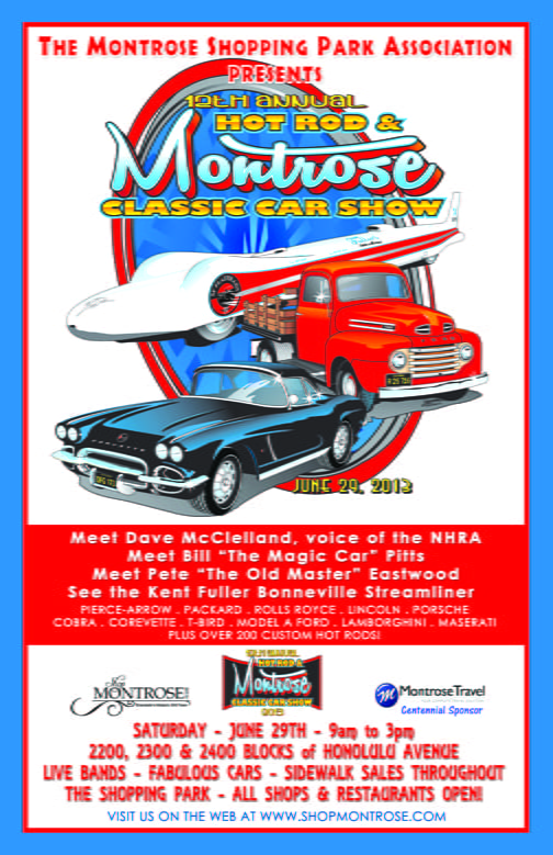 Have you ever heard the sound of seven vintage drag racers “cackling”? This is what racers call it when they rev up their engines. It is absolutely loud and incredibly thrilling. Last year I was able to capture the sound on video and will be sharing it on our Montrose Shopping Park Facebook page to entice you to not miss out this year. The “cacklefest” is a highlight of the car show and takes place at 9:30 a.m. and 12:30 p.m. at Honolulu Avenue and Wickham Way. It will be emceed by none other than Dave McClelland who is known as the voice of the N.H.R.A. (National Hot Rod Association) and a Glendale resident for the last 40 years. Dave is on the board of directors for the NHRA Museum in Pomona and was awarded the Robert E. Peterson 2013 Lifetime Achievement Award for journalism.