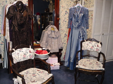 Sometimes you can learn a lot about a store by the way it looks in the back, where most people don’t see. Holiday Hats and Gowns has several parking spots in the lot behind their store. Customers “in the know” park there and enter from the back door. The “secret passage” is like a picture, the back door entrance flanked on either side with potted topiaries and a window with a window box full of seasonal flowers. This is a store that cares about their customer’s comfort. When I was doing this article, I had to take pictures of the fitting rooms. I think they should rent them out, as once inside you will want to move in.