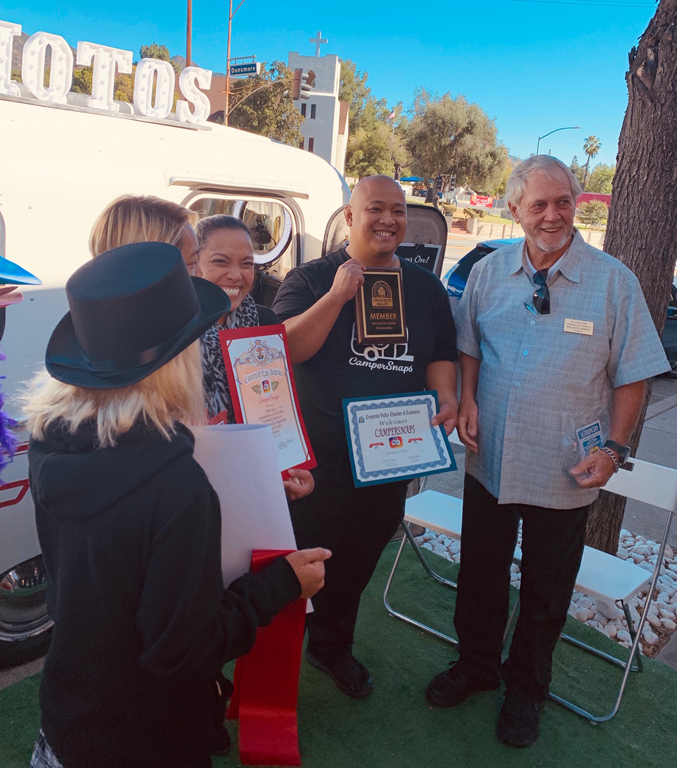 A ribbon cutting ceremony was held by the Crescenta Valley Chamber of Commerce on Saturday, Nov. 23 for CamperSnaps, a unique, mobile photo booth in a vintage camper trailer. It is owned by La Crescenta local Emmanuel Munda, pictured with daughter Elle Munda, wife Kristine, son Aaron and Mike Riley, president of the CV Chamber of Commerce.