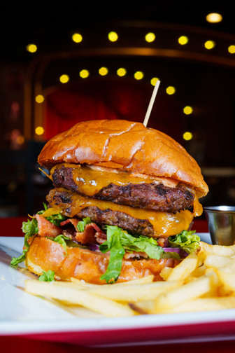 Set in the 1950s, reflecting the height of the Golden Age of Hollywood, it has a Rat Pack-inspired aesthetic while being physically in an upstairs “attic hangout” of an old movie star. Couches are strewn around coffee tables for the more casual diners, and proper tables are set with comfortable – and beautiful – armchairs. Booths line one wall of the dining room with a raised walkway of snug booths beyond those. Red velvet curtains at each snug can be drawn for those who want privacy or kept open to take in the show. “Windows” around the room show a view of nighttime LA looking toward the beach while the other side of the room shows “windows” looking toward a lit-up Hollywood sign. In the corner of the dining room, a jazz pianist and singer set the mood with a classic selection from the Great American Songbook to really immerse diners in the feel of the space.