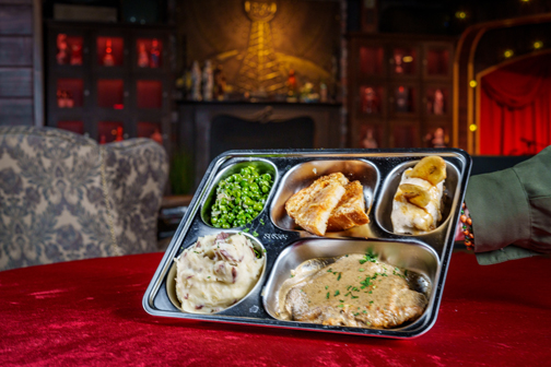 And the food is as impressive as the décor. CV Weekly was welcomed out to the restaurant during its soft opening and, while we didn’t get to try everything, the favorite dish has to be the TV dinner. Served in a metal lunch tray, this is an elevated take on a classic TV dinner – filet mignon or chicken breast in mushroom gravy served with garlic toast, peas, garlic mashed potatoes and a mini banana cake. It’s super cute and absolutely spectacular. Classic flavors that hark back to quintessential Americana, but done in a modern, elevated way so as to hold up to today’s standards. Honorable mention goes to the Swedish meatballs, served in a Madeira Swedish sauce. These are the house meatballs for the Italian restaurant downstairs and pairing them with the Swedish sauce makes them even better.