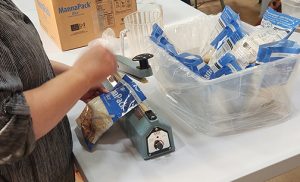 Mary Stanford waits to fill a manna pack with a cup of rice.