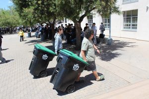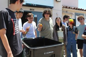 At lunch on Earth Day, April 22, student volunteers stood by two bins specifically designed for food waste. The students educated their fellow students on what can be safely put in the bins. Approximately 40% of all trash is food waste that can be composted under California law.