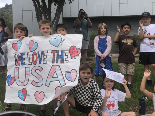 It was a day of emotionally moving moments, from firefighters standing as over 50 vehicles drove past them with those in the vehicles thanking them for their service to hundreds of school students waving flags and yelling “thank you” to the emergency responders, to the Crescenta Valley High School band that played outside the school accompanied with the cheer squad and other supporters. The musicians had just finished a long rehearsal on the school’s track and field and then walked up the Ramsdell Avenue hill to line Community Avenue and play for the motorcade as it passed by. Even after the last car left, the musicians continued to play for the students who stood on the opposite side of the street. At the end of their song the students cheered, then it was back to school.
