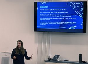 The title of the talk – “Rewired and Overwhelmed. AI, Anxiety and the Price of Progress” – covered how AI can enhance people’s lives but also raise concerns for adults and students due to being a new technology.