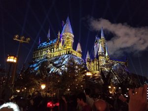 The adventure begins each night in Hogsmeade Village where Hogwarts School of Witchcraft and Wizardry projects realistic, ghost-like images around the outside Hogswarts Castle for all to see. The animations fly and dance across the castle along with a musical arrangement from the Harry Potter movies.