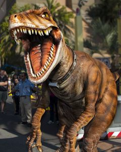 Next to “Jurassic Park – The Ride” is “Raptors Encounter” where guests can come face-to-face with 15-foot-tall carnivorous predatory dinosaurs. The beasts are walking around, kept in line by expert handlers.