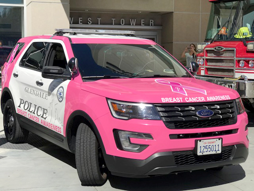 GPD officers applied pink shoulder emblems to their uniforms, added pink to six motorcycles, air support and a Ford Explorer police unit. On Monday, the Ford Explorer revealed its pink wrap at Adventist Health Glendale. The wrap was done by Megaplex Window Tinting in Glendale and the pink ribbons and writing were done by Glendale Officer Teal Metts.