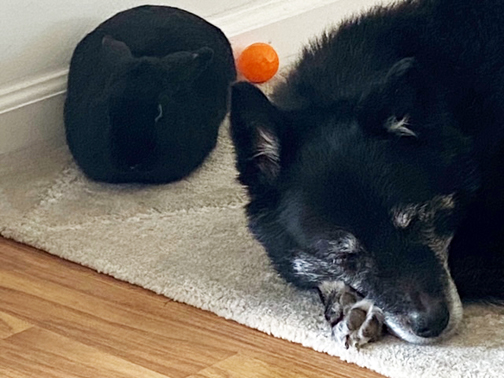These are Tom Hanks and Wilson. Tom Hanks is our 14-year-old shepherd mix that we rescued while living in Georgia. Wilson is our 1-year-old lop mix bunny that we rescued in California. Tom Hanks is named for the actor who we are a fan of, and Wilson is, of course, from “Cast Away.”