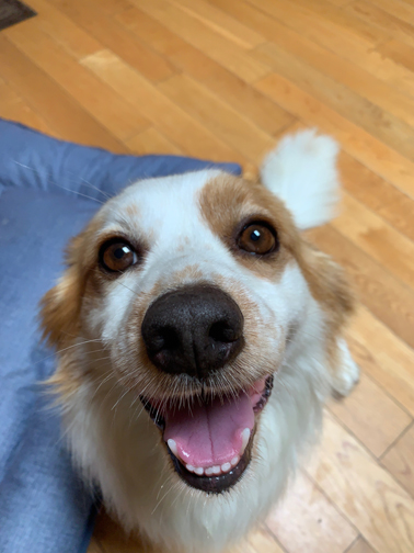 This is Reggie. We rescued him 1½ years ago and he has been a great addition to the family. He is a Kokoni (Greek dog) and is about 6 years old. He has legs the size of half a drumstick and a tail of a Swiffer duster.
