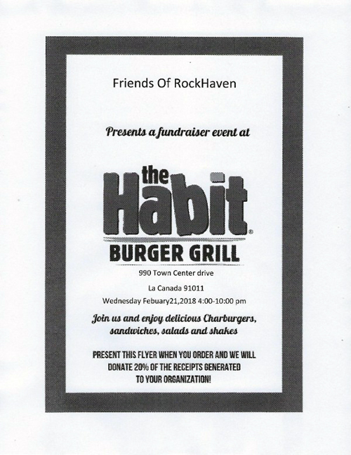 A fundraising dine out night benefitting Friends of Rockhaven takes place at the Habit Burger Grill in La Cañada on Wednesday, Feb. 21 from 4 p.m. to 10 p.m. Present the fundraising flyer (available at www.cvweekly.com/BETWEEN FRIENDS) and the FoR will receive 20% of the receipts generated.