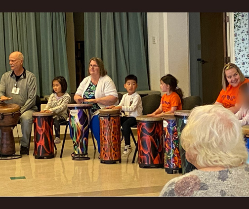 On June 13, The Center for Children invited senior members of La Crescenta Presbyterian Church to join a drum circle activity that the CFC summer day camp hosted at the campus. About 25 kindergarten students and 25 seniors, ranging in age from 4 years to 94 years, spent over an hour playing on drums and exploring the different sounds they could make. They had a great time making beautiful rhythms together!