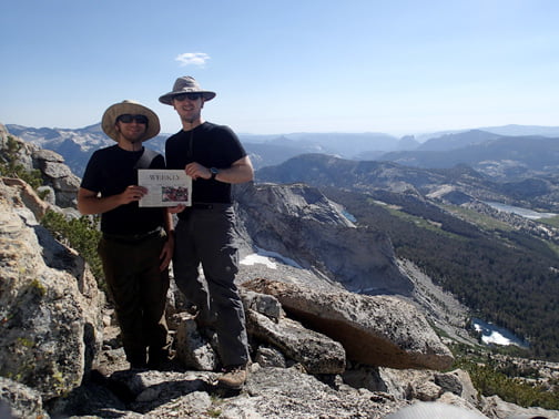 Nick Khasho and Chris Waldheim in Yosemite at the top of 11,493-foot Vogelsang Peak. The lakes are about 2,000 feet below and Half Dome is visible to the west.