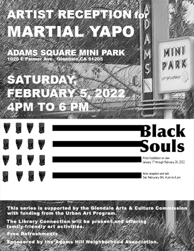 A reception for the art exhibition “Black Souls” by Orange County artist Martial Yapo will take place on Saturday, Feb. 5 from 4 p.m. to 6 p.m. at the historic Richfield Oil Company gas station in the Adams Square Mini Park. The Adams Hill Neighborhood Association is sponsoring this event in cooperation with the Glendale Arts & Culture Commission and Community Services and Parks.