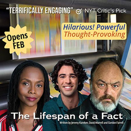 “The Lifespan of a Fact” This highly entertaining, very funny new play follows young intern Jim Fingal whose first assignment at an elite New York magazine is to fact check an essay written by a highly celebrated and cantankerous author. What Jim finds turns his world upside down. Thought-provoking, with zinging one-liners, “The Lifespan of a Fact” explodes into a hilarious slugfest between “facts” and “truth,” making it hard to imagine a play ever being more timely.