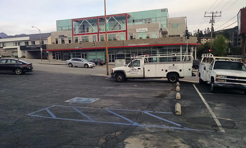 Now » The same view today. A large office building has replaced the market on Verdugo, and the Krieger gas station is now a series of small offices and retail establishments. The photo is taken from the front door of Metta Meditation Studios, which offers guided meditation classes – very different from a gas station!