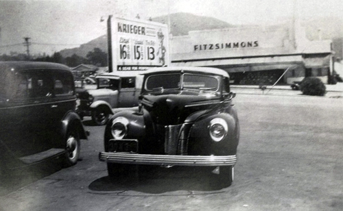 Then » In this shot from the late 1940s, this car, recently customized by local car customizer Link Paola, has just pulled into the Krieger gas station on the northwest corner of Broadview and Verdugo. Check out the gas prices! Fitzsimmons Market can be seen across the Verdugo.