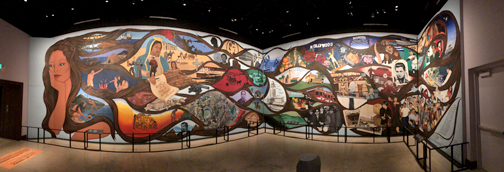 “This was my chance to show what I wish was in the history books,” Carrasco said. She refused to remove the 14 vignettes and so the mural was pulled from exhibition at the bicentennial. It has only been shown twice in 25 years – last year at Union Station, and now on display at the Natural History Museum of Los Angeles as a compliment to their fantastic exhibit, “Becoming LA.”