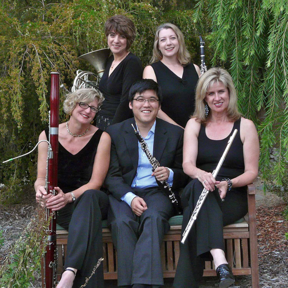 Calico Winds, from left to right, Theresa Treuenfels (bassoon), Rachel Berry (horn), Ted Sugata (oboe), Kathryn Nevin (clarinet), Eileen Holt (flute).