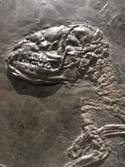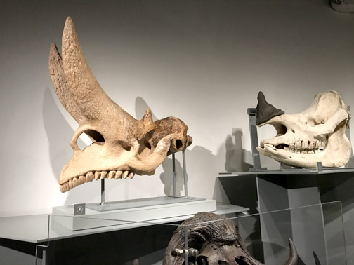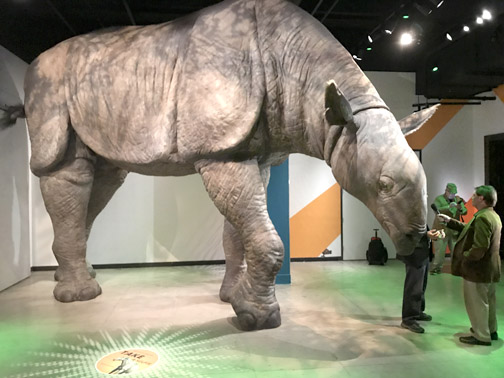 There are those immediate family members from whom we can claim direct descent, like the Repenomamus robustus, a cat-sized mammal that lived in the Cretaceous period (130 million years ago) in what is now China and hunted small dinosaurs. There are those venerated elders who are much older and maybe aren’t much like these mammals today, but still part of the family and your heritage – like Dimetrodon, the early synapsid with a huge sail on its back, from the time before dinosaurs (285 million years ago). There is the cousin who took a different turn somewhere along the path, lost almost all his fur and became a rhinoceros. But he isn’t nearly as weird as the rhino cousin who gave up his horn and grew to almost 20 feet tall, Indricotherium. Or the rhino that wanted a flashy new do, so he grew four horns, two small and two larger than his skull – Arsinoitherium.