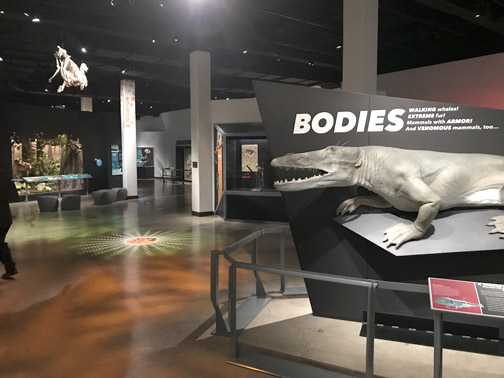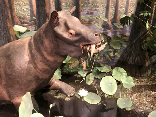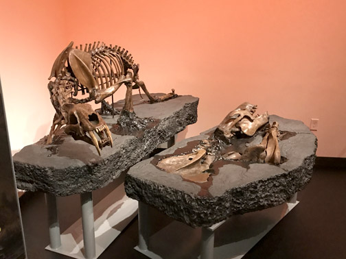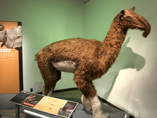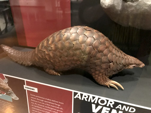 The successful rebels are here too like Ambulocetus, the whale that wanted to walk on land and was a successful hunter in and out of the water. Or the Platybelodon, an elephant that wanted to be a shovel, so its tusks became two fused, flat shovel-like teeth beneath his trunk. Or the Coryphodon, the saber-toothed hippo that stalked the plants of swamps across the northern hemisphere. It’s not really a rebel, just a weird saber-toothed hippo. And the invite went out to the extended family from Australia, the Marsupials. They have built-in pouches for their babies to hang out in, but they are as much a part of the mammal family as anyone. Even the Chinese pangolin, which looks like an armadillo on steroids with claws, is a mammal and welcomed to the party.