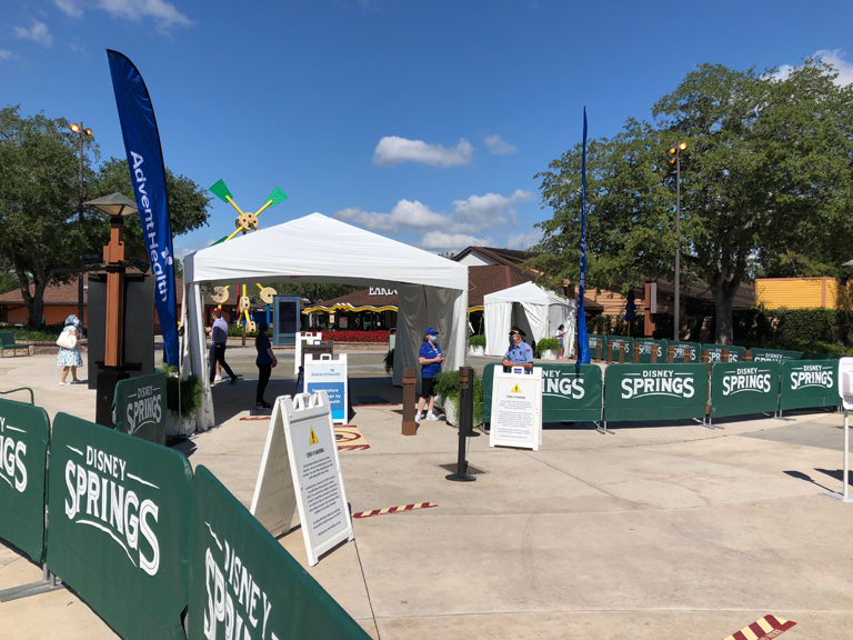 In the muggy Florida summer heat, high temperatures are expected so guests registering a temperature of 100.4° or higher upon entering Disney Springs are sent to a cool-off tent that provides fans, water and hand sanitizer to cool body temperature. Once sufficiently cooled, they are welcome to try the temperature screening again. If the temperature is still up above 100.4° in the second screening, the guest and their party will be denied entry for the safety of other guests.