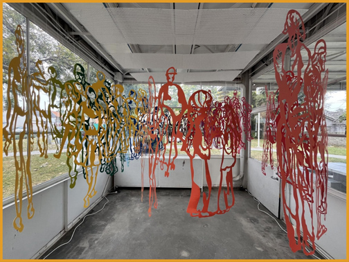 All the People We Encounter Each Day is an exhibit at the Adams Square Mini Park. On display through July 12, All the People We Encounter Each Day depicts a crowd of people swirling like a school of fish, created from layers of painted cut paper suspended from the ceiling with monofilament. The people depicted in the installation are based on individuals artist Amy Oates has seen in public. Oates explores crowds as representative of ephemeral moments where individuals converge to form something abstract yet familiar, embodying negotiations between personal and public space. As she sees greater density necessitating greater attention to social interactions, she explores questions about how we can learn to live within the crowd. She considers ideas about individual and collective identity, alteration, and sustainability.
