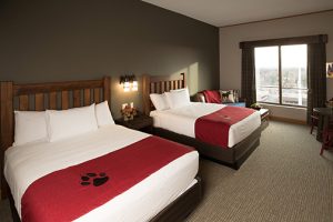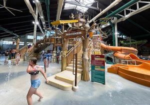 On one side, the giant lodge features a 105,000-square-feet indoor water park packed with exciting tube slides, play structures, pools and more. On the other side, there is a modern hotel, gourmet restaurants, gift shops and arcade games.