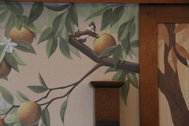 However, what stands out are the cute little Disney touches, like Chip and Dale playing on the branches of a tree painted on the headboard of a bed and surrounding wall, the hanging art like the citrus labels, and the traditional A&C style print in the bathroom featuring Chip and Dale stealing oranges from a tree. They feel organic, like something that is meant to be there, like they could be found in the Gamble House in Pasadena and would fit right in. Guests will find a perfect blend of faithfulness to the original source material – the A&C movement – and Disney magic.