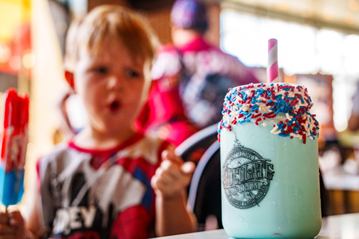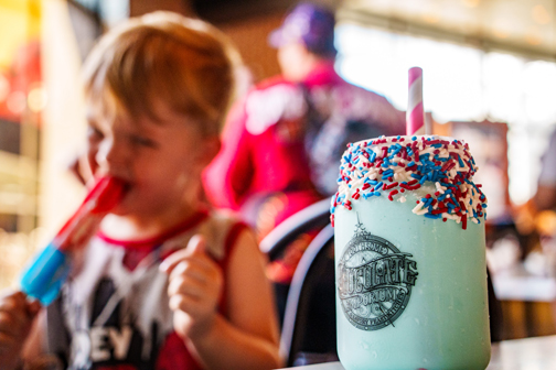 And the newest addition to the menu, the Rocket Pop Milkshake, is a celebratory special edition in honor of the 30th anniversary of CityWalk – vanilla ice cream with buttercream frosting, blue raspberry and strawberry syrups, red white and blue sprinkles and topped with an entire, full-size Bomb Pop popsicle. And while the blue raspberry flavor, the defining flavor note of this shake, might not be quite as enticing at some of the other options on the menu, no one can argue that it’s the most visually appealing and perfect for showing off your summer afternoon on social media.