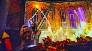Universal has always done some amazing things with projected set extensions (as in the “Transformers” ride and the new Mosasaur scene in “Jurassic World the Ride”), so it’s no surprise to see the technique used here on a more traditional ride type.