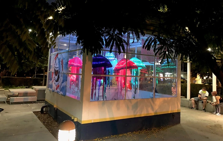 “Bioluminescence Wonderment” is a temporary art installation at the Adams Square Mini Park Gas Station featuring glowing jellyfish. It ends on Aug. 21. The artist is Jennifer Swain.