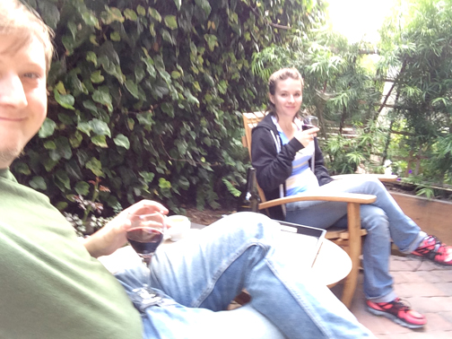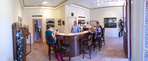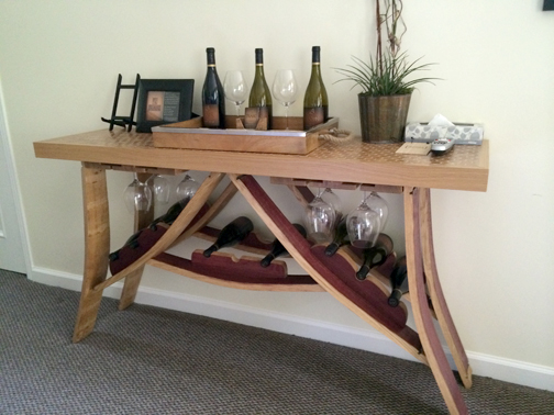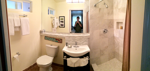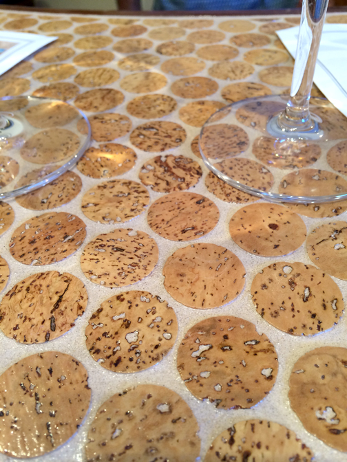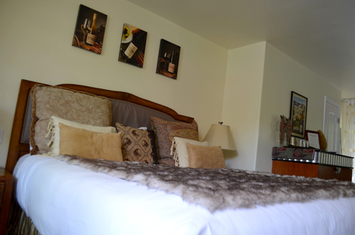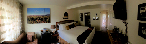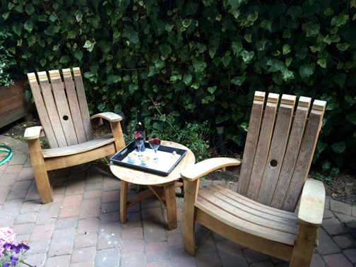 We were invited to stay at Vendange in the Blair Estates winery-themed room. Each room is custom designed and furnished by the winery that sponsors that suite. Blair Estates had chosen a beautiful wine rack table with recycled cork countertop. The cork pieces that were laid into the countertop were from corks that had too many holes in them and were unfit to stop a bottle – a common problem of oversight for the wineries. So rather than throw them away they were made into a countertop. In addition there was a three panel panorama of Delfina’s vineyard – the field of grapes at the Estates with the mountains behind – and old family photos of the Blair family, a vivid purple orchid plant, and two chairs and a table on the patio that were made of former wine barrels. All this in addition to the stock furnishings provided by Vendange in every room – a flat screen LCD TV, stone tiled bathroom and shower, and the deepest, most plush California King bed I have ever slept in.