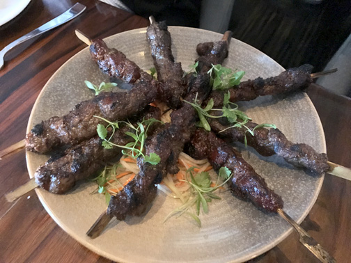 Not all of the summer fun is gone yet. The pickled green papaya-topped Thai beef skewers and the ice-cold oysters still linger for a bit of distinct summery flavor, but the charred yet herbal lamb lollipop chop with chimichurri sauce and lavender mint and the “Bruce Lee” Wings, loaded with cumin and crispy fried with just the right amount of spice, foretell of cooler days to come. Out of everything, my favorite has to be the Thai beef skewers. The thick grilled chunks of beef are spiced with exotic flavors that make the salty, savory skewer perfectly balanced with the sweet and tangy pickled green papaya. It’s like beef jerky that isn’t dehydrated. I know that sounds weird, but it totally works. Those kinds of dishes, the ones that surprise the diner and make a bricolage combination of opposing ideas work well together, are always the ones remembered most fondly and intensely.