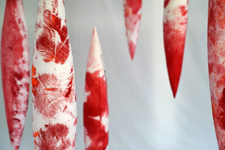 “Spindles 100: Hers” is an installation involving 100 suspended textile sculptures. The tree-pod sculptures symbolize life and time as well as exclusively feminine work made by hand. The handprints are both universal and individual and demonstrate memories of touch and the collective unconscious. The installation is essentially about nature, women, community of women, empathy, life, blood, work, courage, pain and compassion.