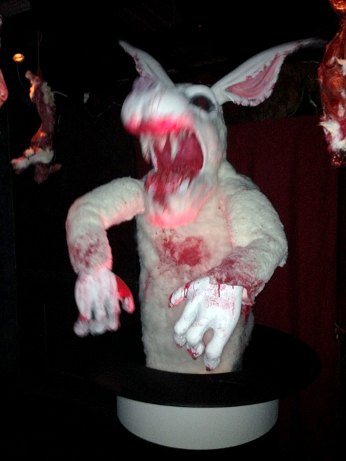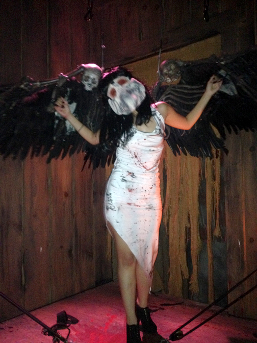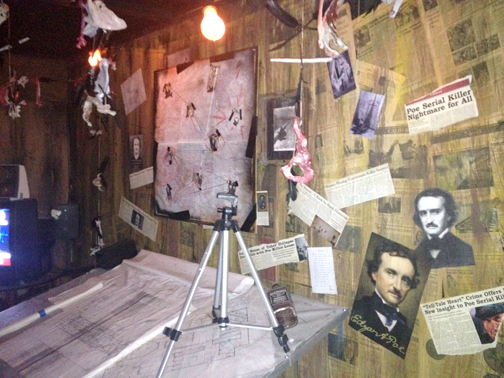 Pros: Really cool idea. Throughout the maze, each room is smeared in blood with the title of the story it is based on: ‘The Raven,” “The Tell Tale Heart,” “Murder in the Rue Morgue,” “Pit and the Pendulum” and many more. In each room, the poem is read from speakers in lieu of a soundtrack, leaving the room filled with the eerie prose of Poe and the sounds of creaking doors, rattling chains and screams.