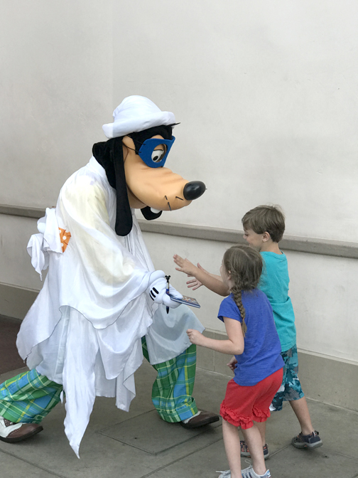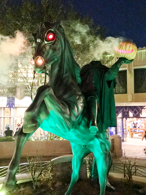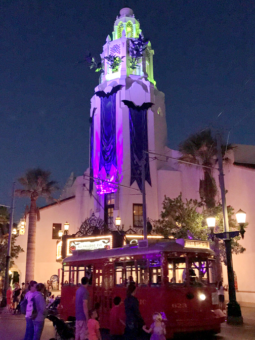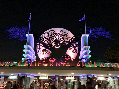 The new improvements for Halloweentime are everywhere. The new decorations in Cars Land are really cute and worth a look for pictures. Look out for some Halloween surprises in the smaller attractions of that land – Luigi throws a spirited party at “Luigi’s Honkin’ Haul-o-Ween” and “Mater’s Graveyard JamBOOree” gets into the swing with car-themed Halloween music. The photo ops and decorations out in front of the park feature Oogie Boogie above the entryway and set the perfect tone for what’s to be found inside – bats in the belfry of Carthay Circle, a headless horseman in the planter bed on Buena Vista Street and all the favorite Disney characters dressed in their Halloween costumes.