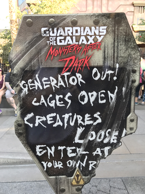 Disney invited me to the park to see some of the new Halloweentime additions and, I have to say, I am more impressed by this showing than a lot of what the other parks had to offer. Most of the parks maintained the status quo; Disneyland improved. It used the recent success of its newly opened ride “Guardians of the Galaxy- Mission: Breakout” to its advantage by adding an attraction overlay to it at night featuring “Monsters After Dark.” Guests are still swarming the ride because it’s the new thing and super fun. Now to give them an extra bonus at night, a reason to come ride it twice, is genius. MAD is essentially a sequel or follow up to the daytime experience. During the day, Rocket Raccoon breaks the Guardians out of The Collector’s Museum, freeing all the alien monsters and escaping in the chaos. At night, they realize Groot has been lost in the shuffle and Rocket has to break back into the museum, which is now running rampant with monsters and has failing power, all set to a “1970s Rock”-style song by the composer of the films’ score, Tyler Bates. Brilliant!