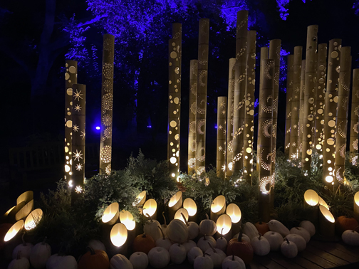 Hanging basket lanterns lit up the way to the next location paired with glowing bamboo carvings with intricate designs. A sea serpent made of pumpkins was found lurking in the water.