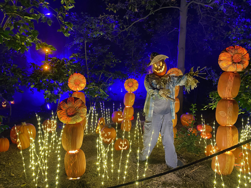 Many jack-o-lanterns wore smiles, grins or scary faces when greeting visitors throughout the grounds. The light displays with the pumpkins gave a spooky air to the night, along with fog effects and ghostly sounds. A scarecrow jack-o-lantern exhibit that featured pumpkins as tall sunflowers was a perfect Halloween picture opportunity with the family.