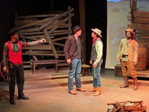 While the electrician Raymond Brown is the titular character of “Eléctrico,” the driving force of the play is the widow Adela Borrego. Brown’s spirit has been crushed by the loss of his wife; his passive suicidal ideation leads him to take potentially deadly risks such as removing the lynched body of Adela’s husband from the telephone pole, left as a warning to other Mexicans. By contrast, Adela wishes she had defied her husband to prevent him from taking the risk that resulted in his murder. After his death, she embraces her fury and champions her vaquero heritage – the name of Mexican cowboys who preceded and inspired the better known Buffalo Bills and Annie Oakleys of the West. When Brown’s mixed race identity is discovered, she fights to rescue him from her husband’s fate – even against Brown’s wishes.