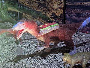 I brought my two sons – 5 years old and 1 and a half – to see what was offered. From the moment we walked in, we were greeted by a towering Giganotosauraus, bellowing loud enough to rattle the strollers. The entire dinosaur exhibit had been dressed up for Halloween with a T. rex wearing a chicken hat and a Coelophysis decked out in a hot dog cape. It was absurd and adorable all at once – and loud. Very loud.
