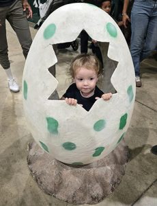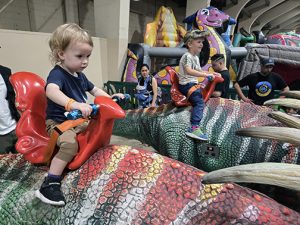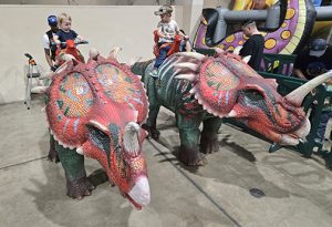 Behind the main dinosaur hall was the excavation station where kids could dig for “fossils” in bins of sand, and a small craft corner for coloring and creating their own prehistoric masterpieces. But as any parent could predict, the real draw was the play area – a sea of bounce houses, inflatable slides and rideable dinosaurs. That’s where we spent most of our time as the boys bounced themselves into exhaustion and I silently calculated how many gallons of hand sanitizer we’d need afterward.